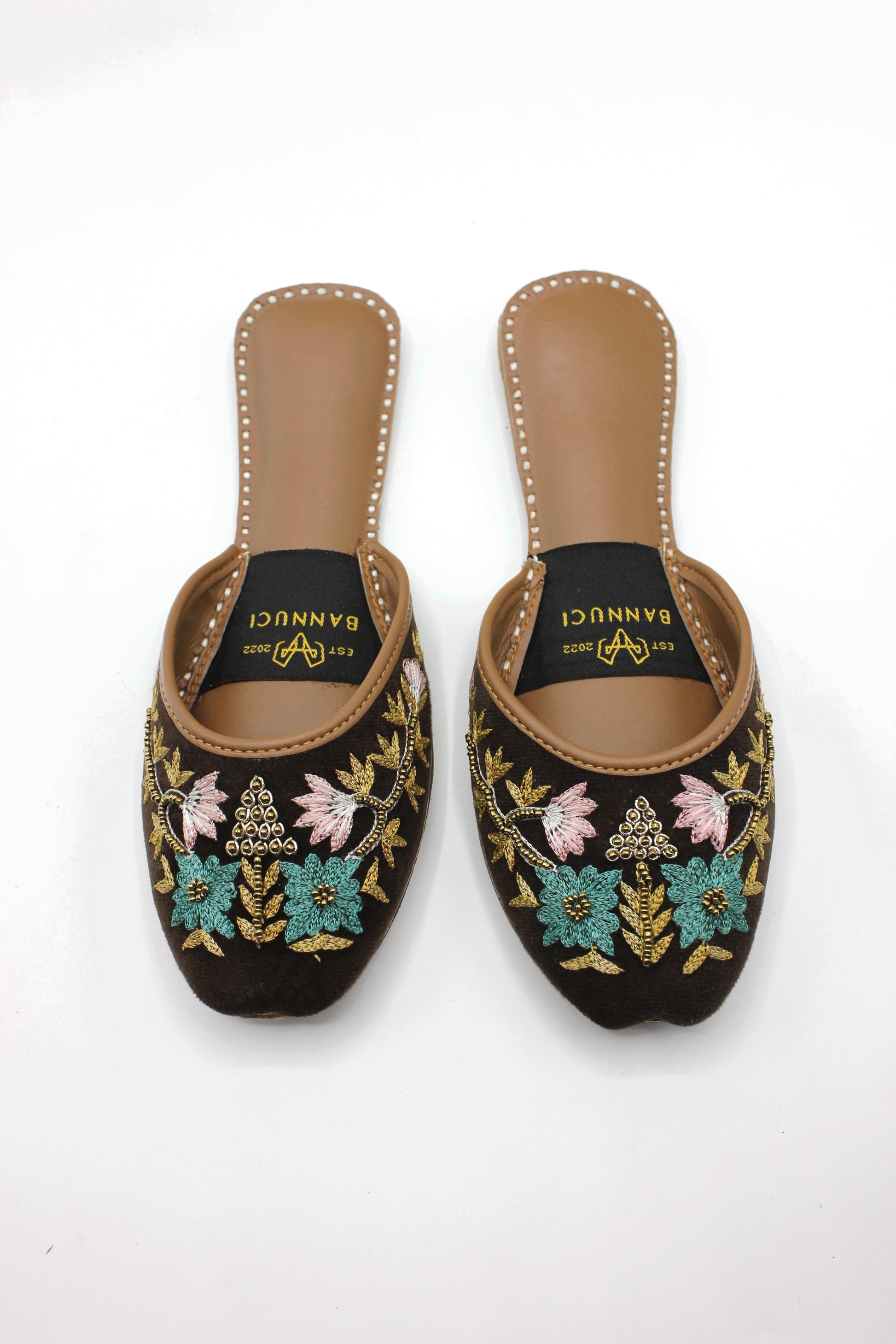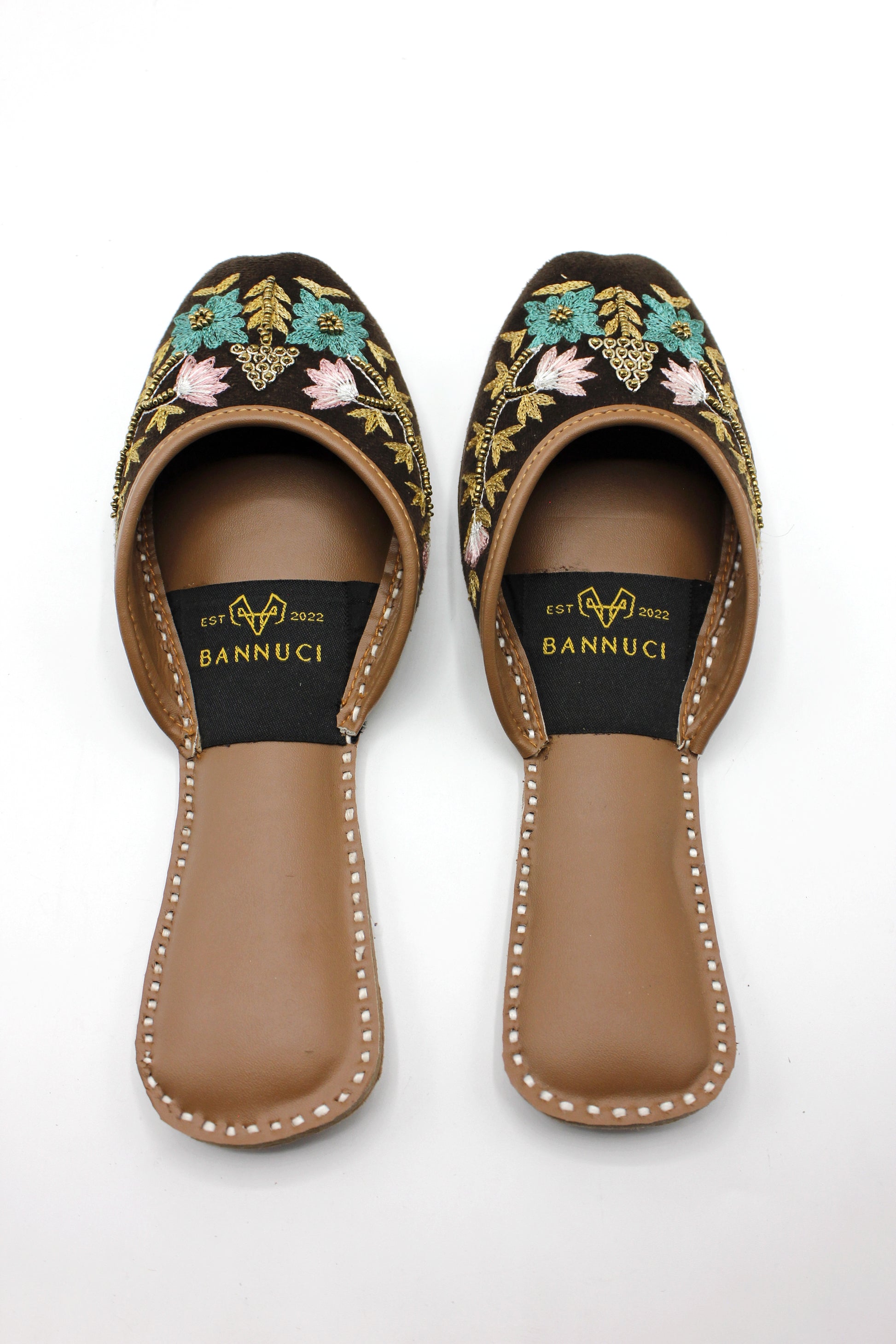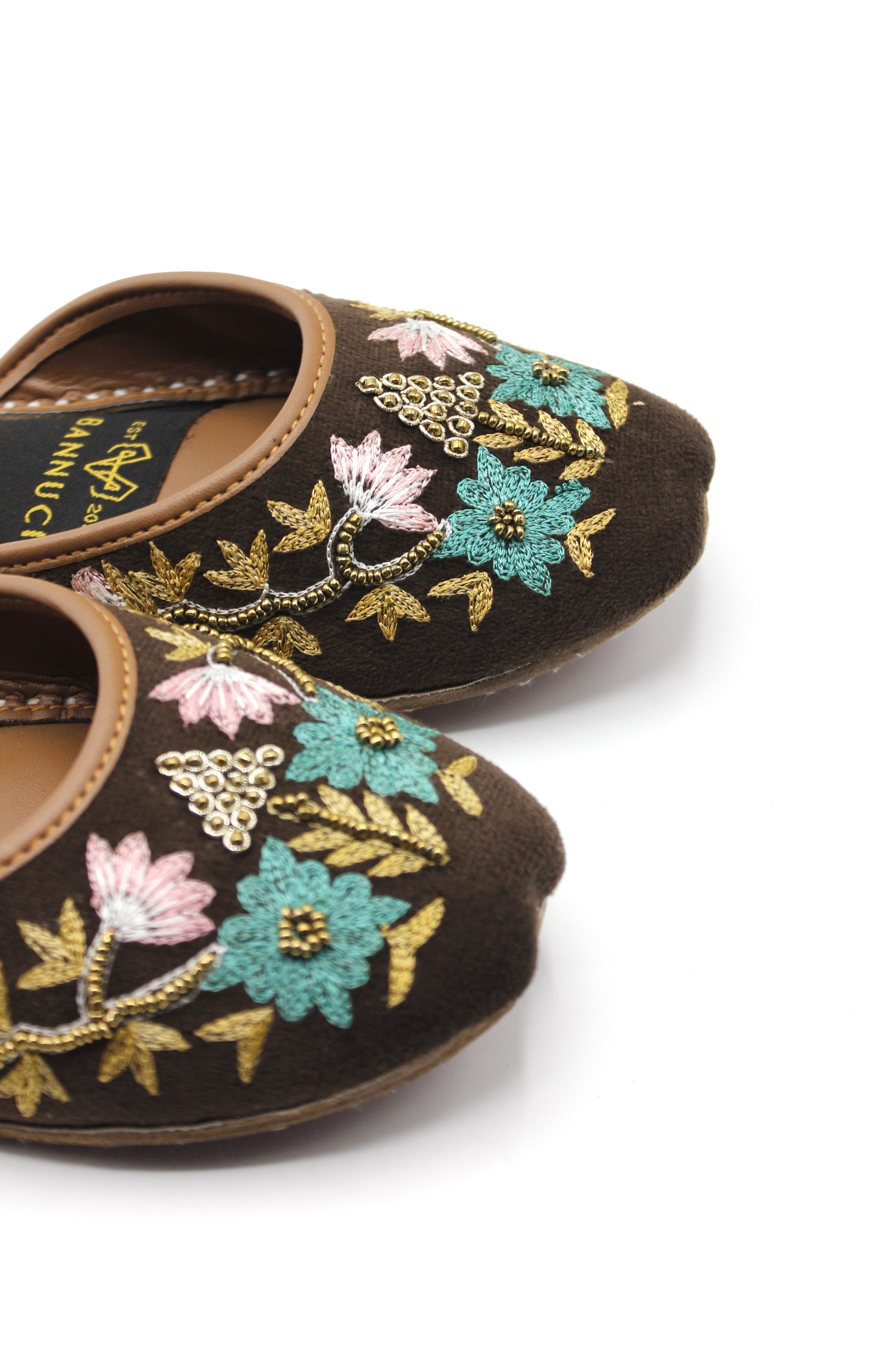 Premium Quality Back less Dark Brown Multi Color Embroidered Khussas